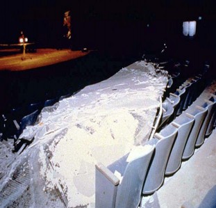 The picture on the left shows damage to hanging light fixtures that were not seismically secured. The picture on the right shows the collapse of a false ceiling.
