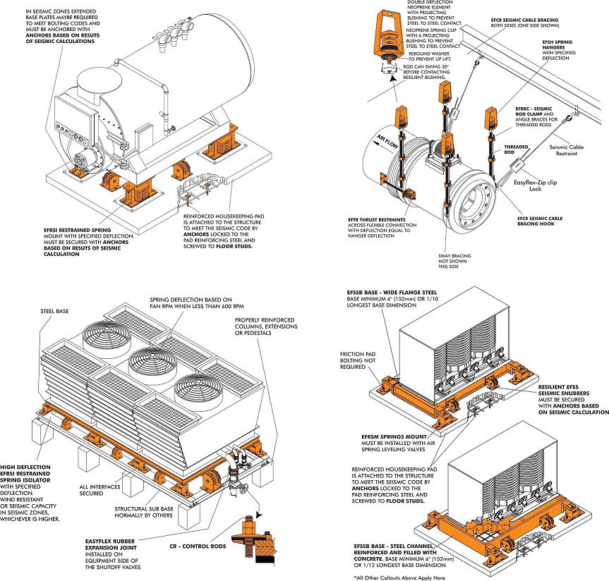- Axial Blower with EFTR Thrust Restraints suspended by EFSH Hangers and restrained by Easyflex-Zip Clip Seismic Wire Rope Kit.