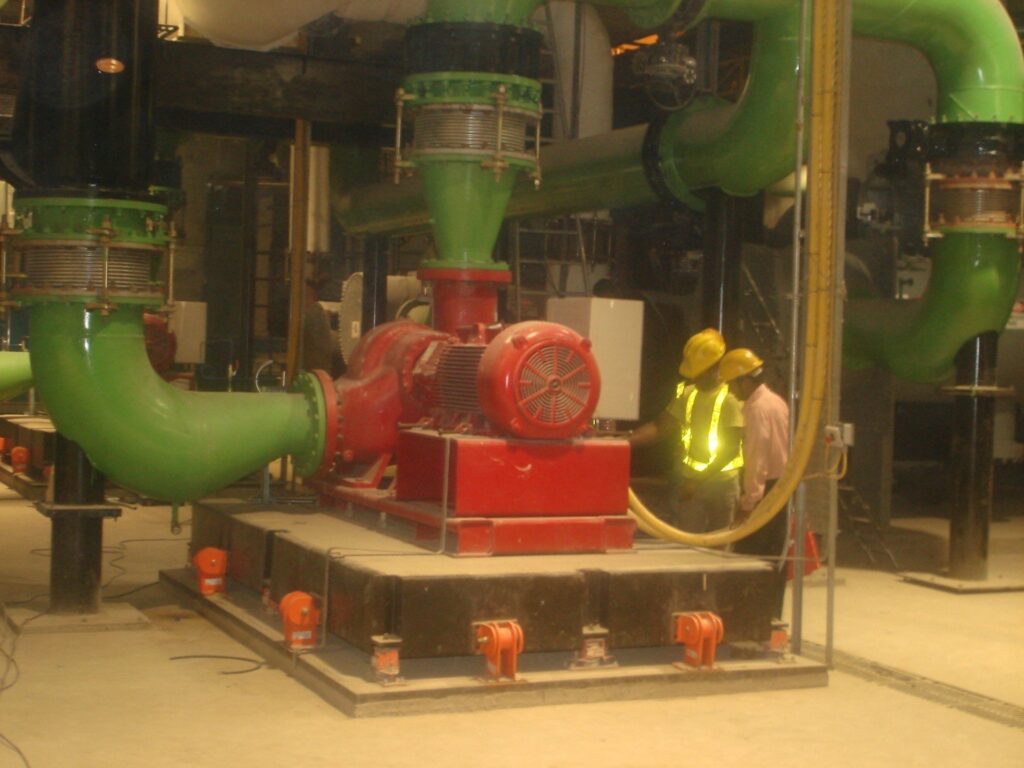 - Large Multi Section Cooling Tower secured to steel base and beam supports using EFRSI Restrained Spring Isolators and EFSS Seismic Snubbers.