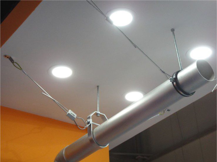 When ductwork, electrical conduits, and piping are hung from the ceiling (whether by rods or trapeze supports), seismic bracing is used to resist horizontal forces. The bracing protects the equipment and its hangers (often threaded rods or trapeze supports) from lateral (perpendicular to the run of the conduit) and longitudinal (parallel to the run of the conduit) shaking.